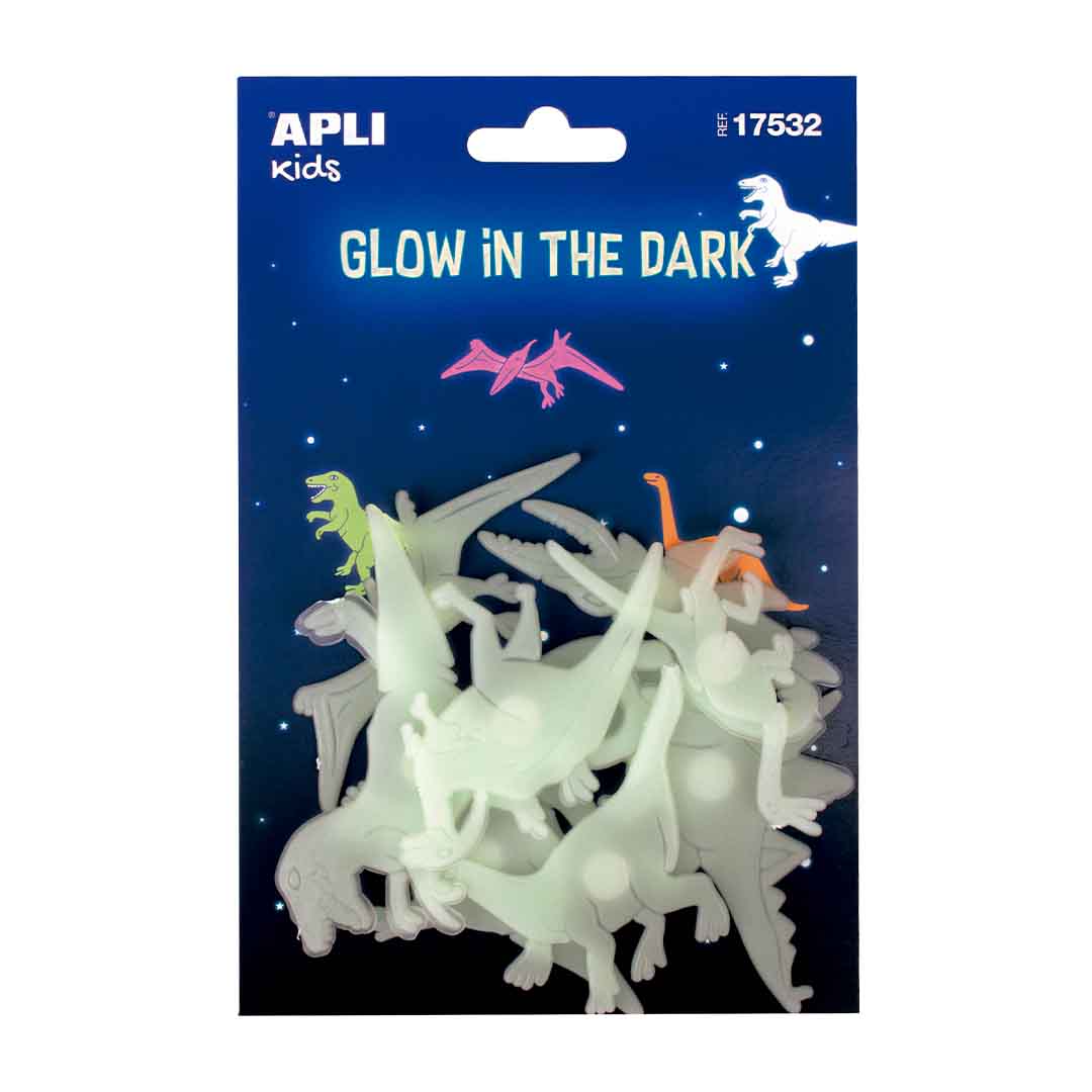 Dinossauros 3D de plástico sólido luminescentes. Cada bolsa inclui 9 dinossauros em tamanhos variados. Formas que brilham no escuro, 2 mm de espessura. Eles têm um ponto adesivo na parte de trás para colá-los onde você quiser. Ideal para decorar salas, cadernos, pastas, etc.