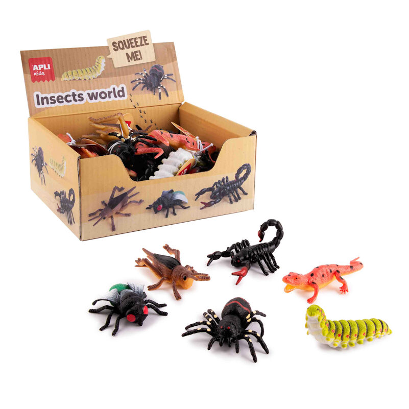 O expositor contém 24 insetos de 6 modelos diferentes (4 unidades de cada). Fabricados com silicone de qualidade, retornarão ao formato original após cada uso.