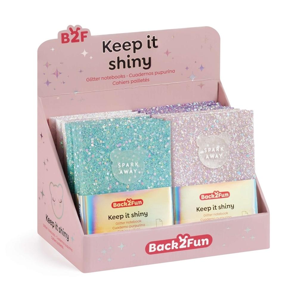 Conteúdo: Inclui 12 unidades, 3 de cada modelo. Caderno: 117 x 150 x 20 mm. Capas: Papelão com acabamento glitter e adesivo de silicone. Encadernação: Colada.